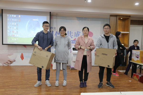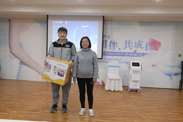 简单的休息玩乐后,活动来到最后一个环节:连环大抽奖。本次沙龙特设一等奖一名,奖品为多功能蒸汽挂烫机;二等奖两名,奖品为多功能电饭煲;三等奖三名,奖品为婴儿抱被。其中,值得一提的是,本次沙龙二等奖的两位获得者全部都是上台体验分娩阵痛的家庭。