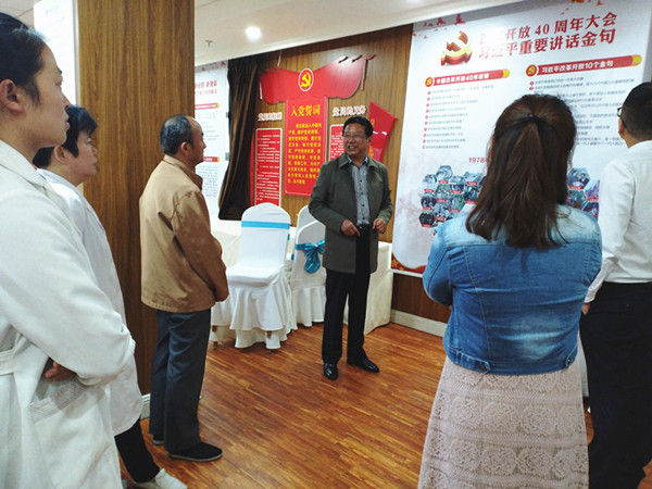 会议结尾,王怀才书记带领参会的党务工作者参观学习院内的“改革开放40周年大会习近平重要讲话金句”、“共产党人的初心和使命”以及“十九大重要内容解读”等宣传画报的内容,并向大家讲解了其中传达的思想精神。